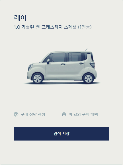 개인사업자, 법인사업자 등에게 인기 좋은 기아 레이 밴을 구입하고자 하신다면, 먼저 기아 공식 사이트에서 견적을 내보시고 전화상담을 요청하거나, 가까운 기아 대리점을 방문하여 구체적인 상담을 받기를 추천합니다. 공식 가격과 재원을 모른 채 온라인의 정보만으로는 충분히 자신에게 맞는 옵션을 선택하기가 어려운 점이 있기 때문이죠.