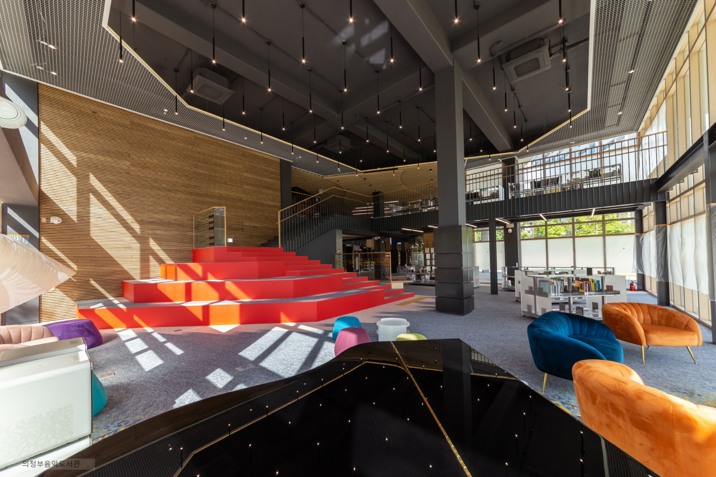 의정부 음악도서관은 기존 도서관과 차별화된 독특한 경험을 제공합니다. 감각적인 인테리어와 뮤직홀, 개별 테이블에서 음악을 감상할 수 있는 시설이 돋보입니다. 의정부의 지역적 특색을 반영해 블랙 뮤직을 테마로 디자인되었으며, 시각적으로도 풍성한 음악 감상을 제공합니다.