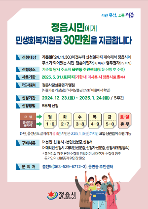 - 정읍 1인당 30만원: 온라인 2024. 12.23 ~ 2025. 1. 24 / 온라인 2025. 1. 21 ~ 2025. 3. 3