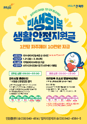 - 파주 1인당 10만원 : 온라인 2025. 1. 15 ~ 2025. 2. 28 / 온라인 2025. 1. 21 ~ 2025. 3. 31
